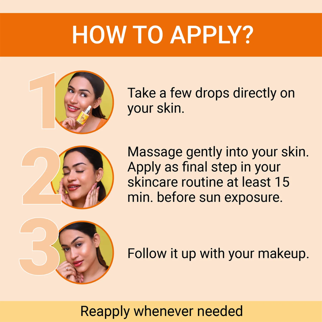 - Apply: Take a few drops and massage gently into your skin as the final step of your skincare routine, at least 15 minutes before sun exposure.